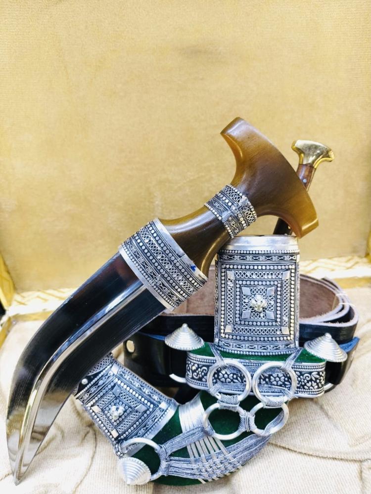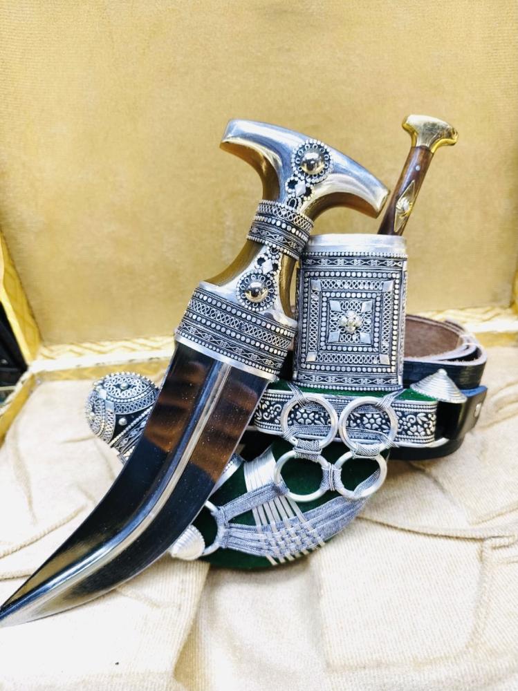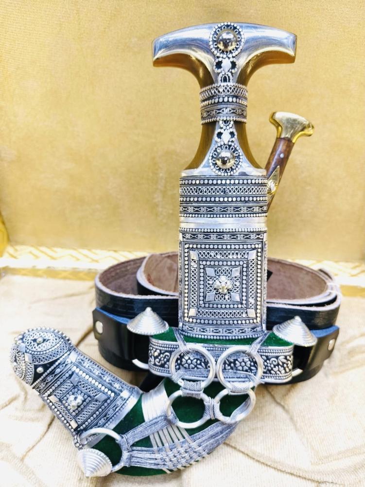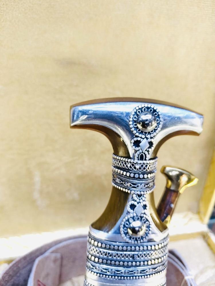 قطعة فنية رائعة تتميز بجودتها العالية ومظهرها اللامع. يتكون هذا الخنجر من فضة مختلطة مع معادن أخرى لتعزيز المتانة والصلابة، مما يجعله مثاليًا للاستخدام كقطعة زينة أو كعنصر تقليدي في المناسبات.